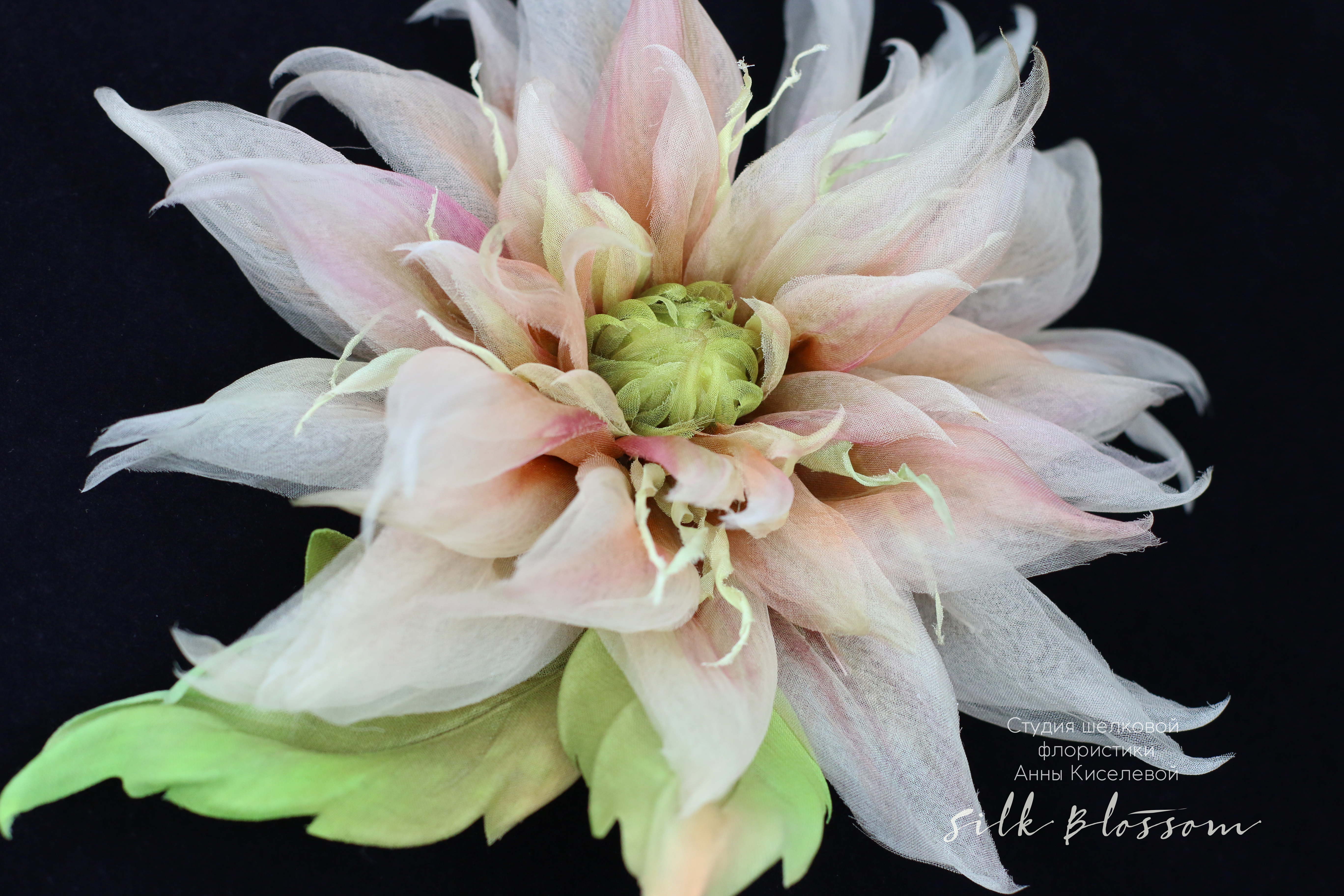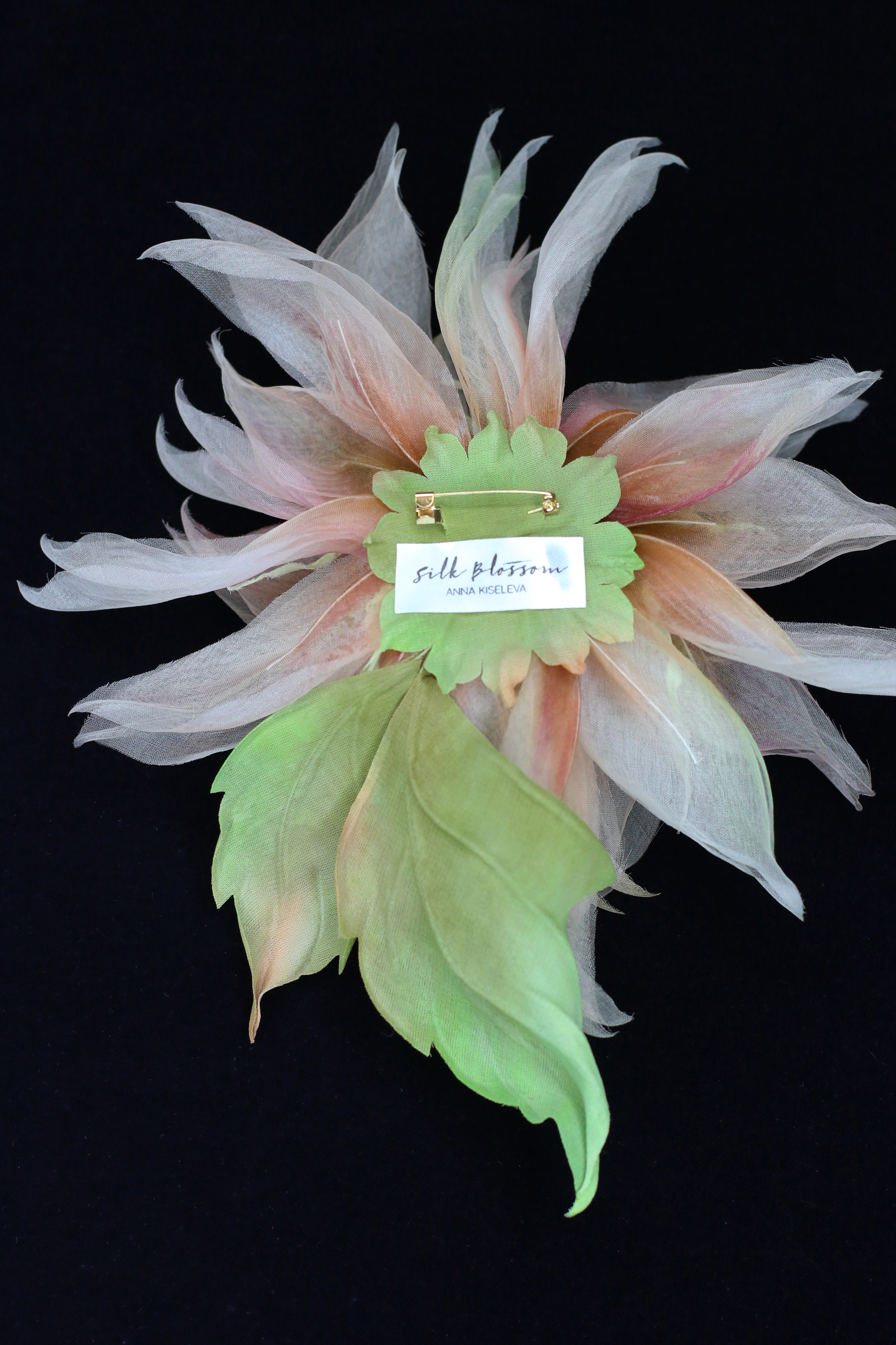 Крупный, сложный цветок, собранный вручную из натуральной шелковой органзы. Полупрозрачные лепестки наслаиваются, создавая глубину, свет и едва уловимое движение — как будто цветок живёт своей тихой жизнью.