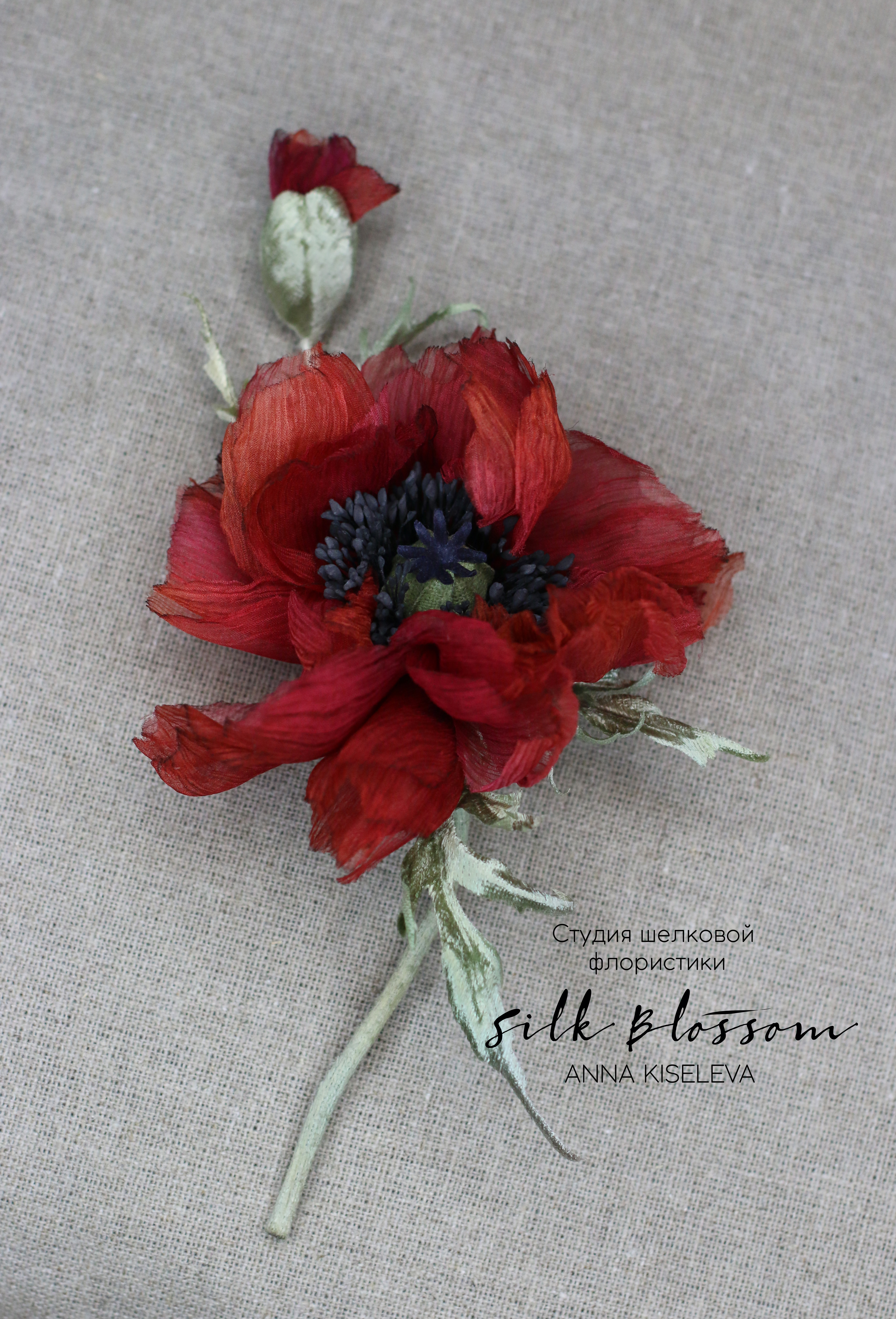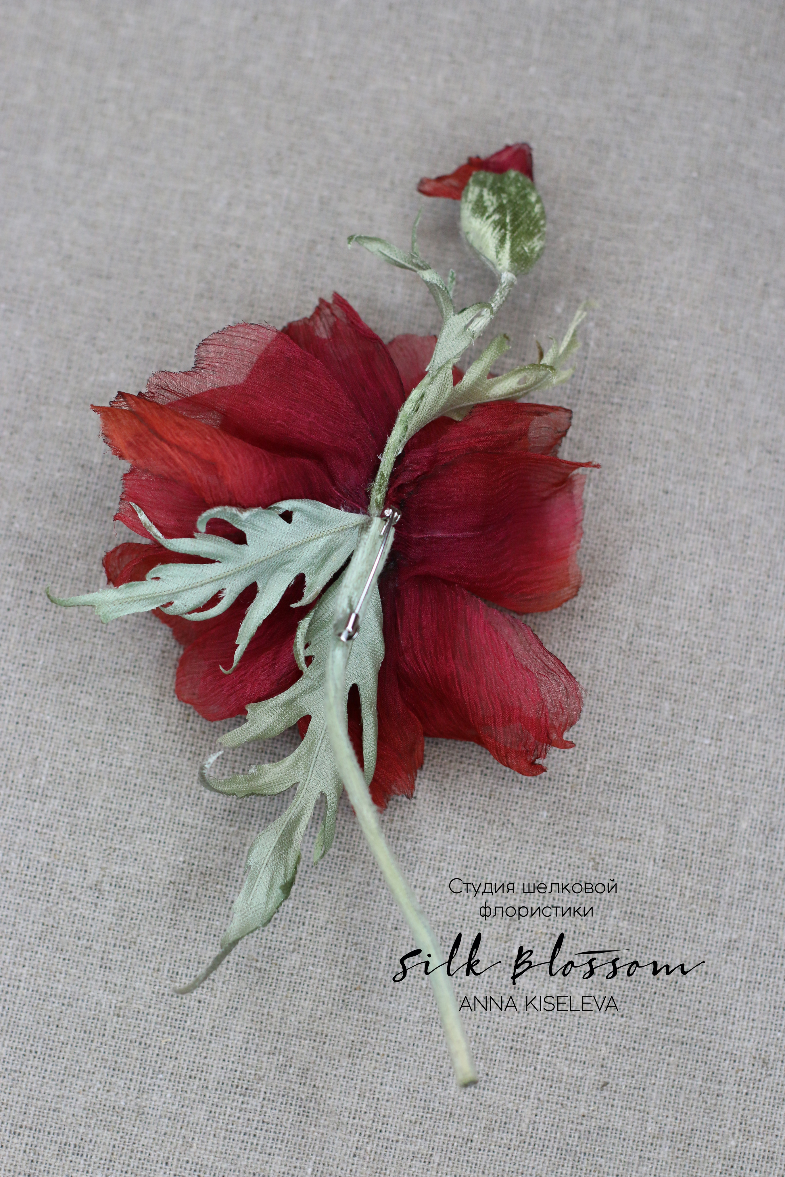 Брошь - мак из натурального шелка и бархат глубокого красного цвета со светлой фисташковой зеленью. Полностью ручная работа.